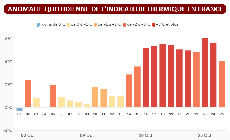Anomalie quotidienne de l'indicateur thermique national en France du 1er au 25 octobre 2022 – via France Info