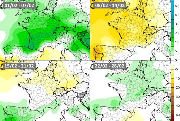 Côté précipitations, le modèle européen associe un temps perturbé et copieusement arrosé à la douceur du début février. En revanche, il n'y a pas plus d'anomalies pluviométriques que d'anomalies thermiques se dégageant pour les trois semaines suivantes. Le modèle propose ainsi un scénario dans les normales sur l'ensemble de la France.