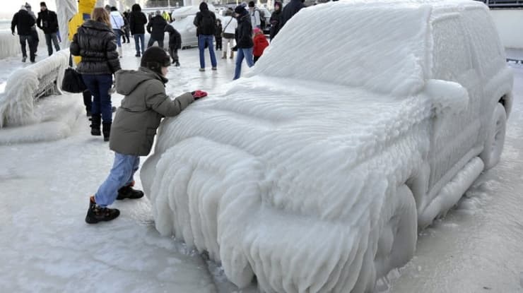 Voiture glacée par les embruns du Lac Léman à Genève lors de la vague de froid de février 2012 - via Keystone