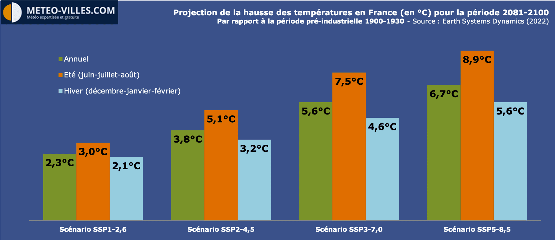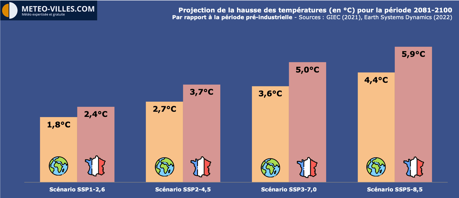 Une hausse plus importante sur notre pays qui s'avère confirmée quelque soit le scénario. En effet, que cela soit le scénario le plus optimiste (SSP1-2,6), intermédiaire (SSP2-4,5), pessimiste (SSP3-7,0) ou même extrême (SSP5-8,5), la température en France augmentera de manière plus significative que la moyenne mondiale d'ici l'année 2100. Dans le scénario le plus extrême, cette hausse pourrait même atteindre +5.9°C en France sur la période 2081-2100 contre +4.4°C au niveau mondial.