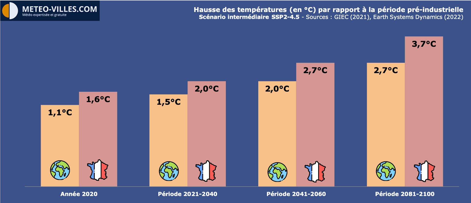 Projections de la hausse des température en France et dans le monde par rapport à la période pré-industrielle - scénario SSP2-4.5 - GIEC &  Earth System Dynamics