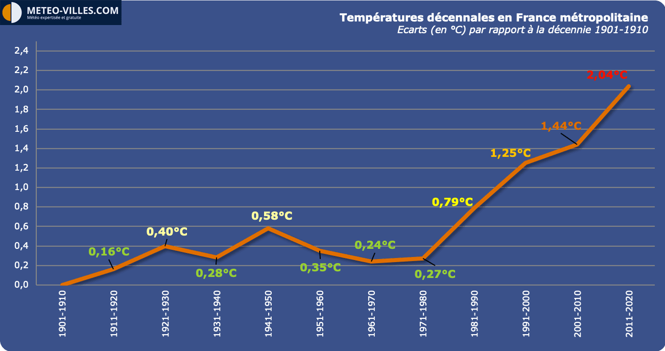 La publication des toutes récentes moyennes climatiques de la nouvelle période de référence (1991-2020) par Météo-France avaient déjà mis en évidence une sensible accélération du réchauffement climatique dans notre pays. Sur la base de l'indicateur thermique national (un indicateur basé sur 30 villes réparties à travers le territoire), le réchauffement à atteint +2.04°C en France sur la décennie 2011-2020 par rapport à la période 1901-1910.