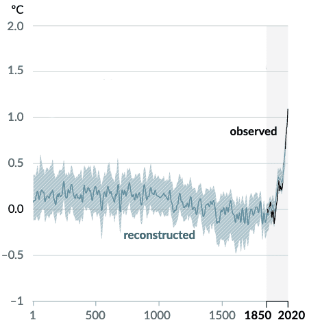 Évolution des températures dans le Monde (archives paléoclimatiques jusqu'en 1850) sur les deux derniers millénaires - 6e rapport du GIEC (2021)