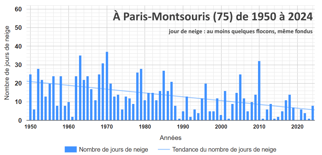 Jours de neige (au moins quelques flocons) à Paris-Montsouris de 1950 à 2024