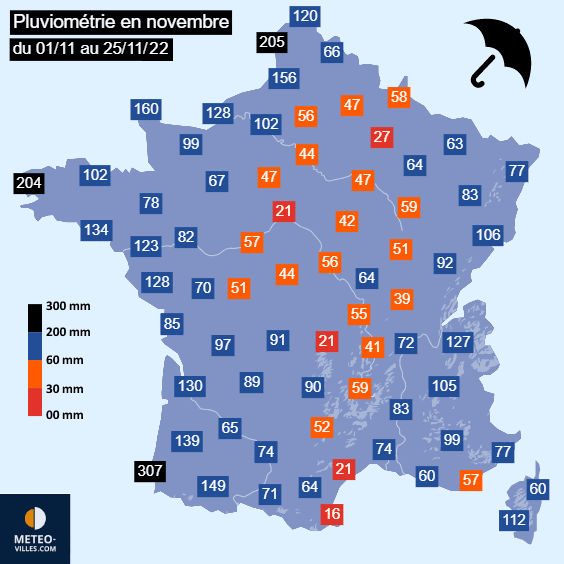 Cumuls de pluie enregistrés par les stations entre le 1er et le 25 novembre 2022 - Météo Villes