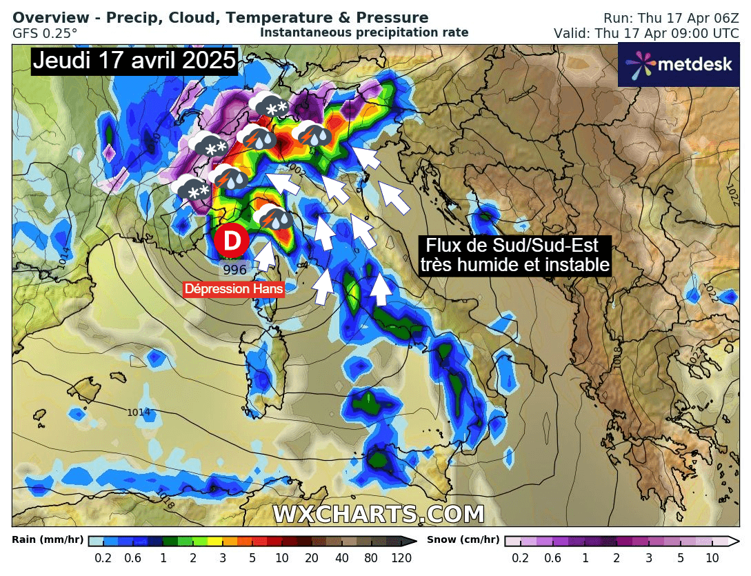 Mais c'est surtout à partir du 15 avril que la neige devient vraiment exceptionnelle du côté des Alpes. Durant cette journée, une perturbation se réactive en arrivant sur le Massif-Central et est rattrapée par de l’air très frais en provenance d’Islande, engendrant ainsi d'importantes chutes de neige au-dessus de 400 à 600m d'altitude en Auvergne.