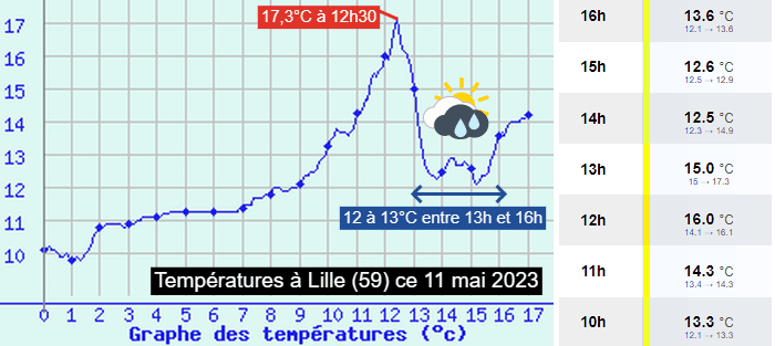 Toutefois, cette "anomalie" douce peut apparaître trompeuse en comparaison de notre ressenti. En effet, la météo de cette première décade de mai s'est montrée instable si bien que les températures diurnes ont tendance à beaucoup fluctuer. Ce jeudi 11 mai 2023 à Lille, la température maximale qui comptera pour les statistiques est de 17,3°C, valeur très proche de la norme. Cependant, elle fut brièvement atteinte vers 12h30 puis des averses se sont abattues l'après-midi. Entre 13h et 16h, il ne faisait pas plus de 12 à 13°C. Le ressenti général est donc bien plus frais que la valeur qui sera retenue pour la climatologie.