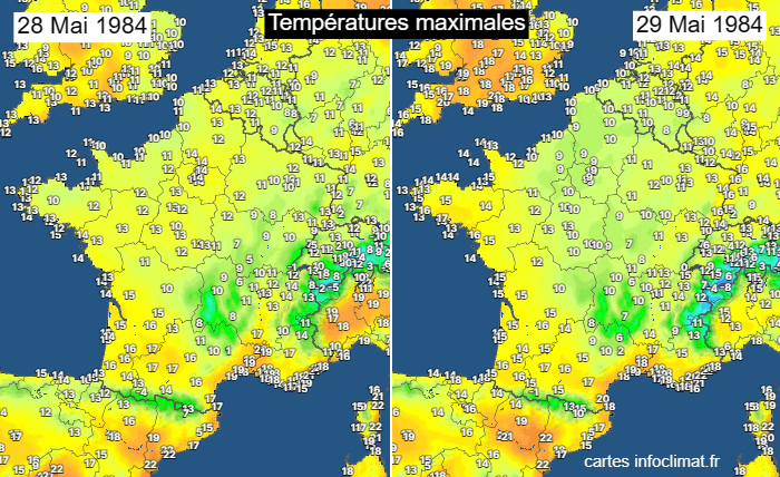 Températures maximales mesurées les 28 et 29 mai 1984 - via infoclimat.fr