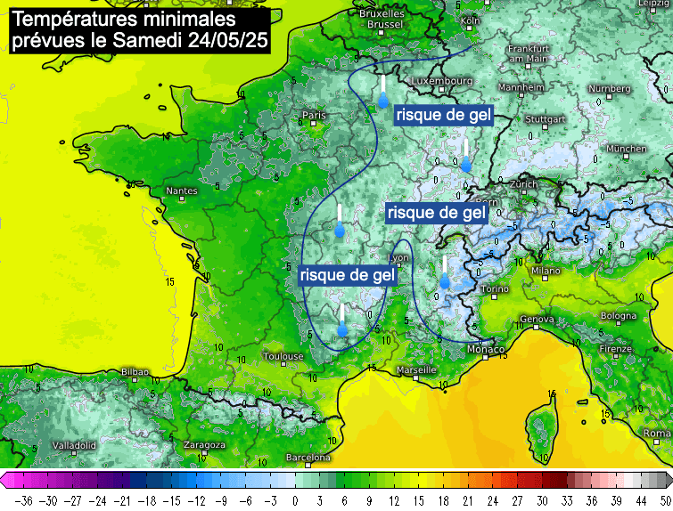 En fin de nuit et matinée du samedi 24 mai 2025, ce petit risque de gel sera présent sur l'est de la France, principalement de l'Auvergne aux frontières de l'est. Les valeurs minimales vont souvent s'abaisser entre 0 et +3°C avec quelques valeurs légèrement sous le zéro possibles dans les secteurs traditionnellement les plus froids.