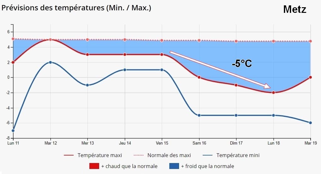 Ainsi, le retour des températures de saison ne sera que très temporaire avec un froid s’annonçant de nouveau marqué dès le week-end et ce jusqu’en cours de semaine suivante. Certaines régions de l’Est et du Nord-Est du pays pourraient retrouver des journées sans dégel alors que les températures maximales perdraient entre 5 et 10°C suivant les régions.