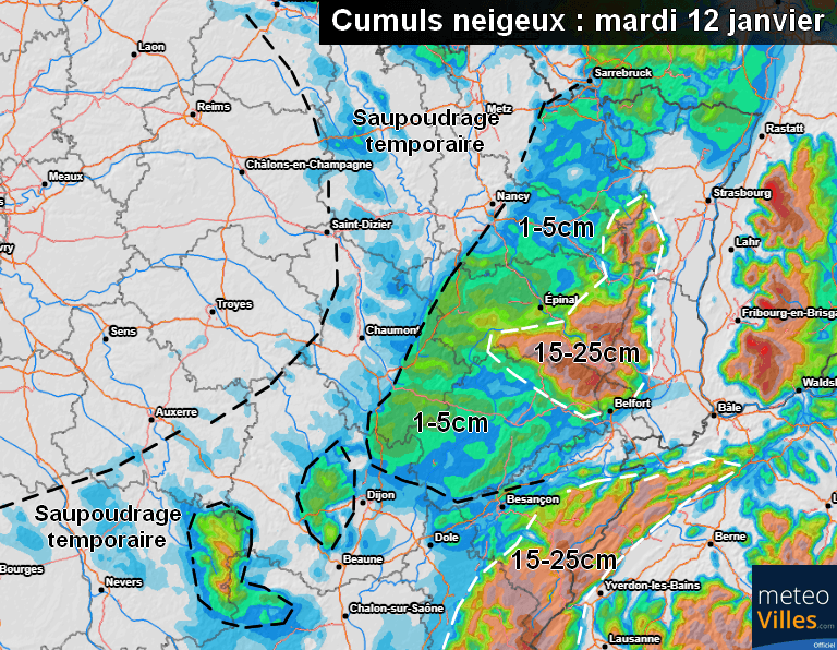 L’air océanique devrait peu à peu prendre le relais par la suite, annihilant tout risque de neige en plaine dès la nuit suivante ainsi que pour la journée de mercredi 13 janvier. Les précipitations neigeuses devraient néanmoins se poursuivre au-dessus de 1200-1300m d’altitude avec 10-20cm supplémentaires sur le Nord des Alpes.