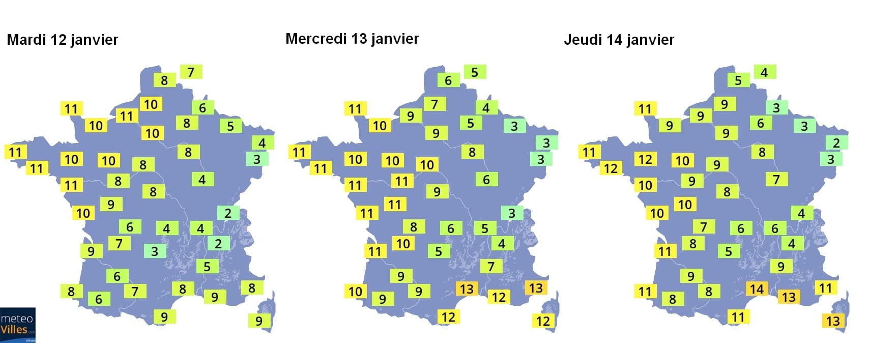 Températures maximales prévues entre mardi 12 et jeudi 14 janvier sur la France – Météo-Villes