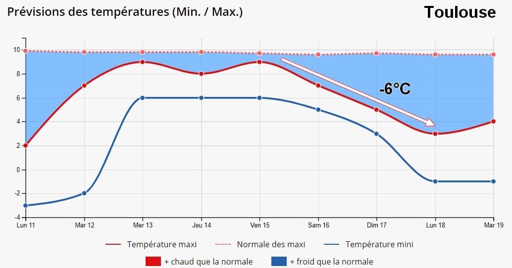 Sur le reste du pays l’air océanique devrait s’imposer en milieu de semaine avec le retour de températures de saison en journée, le risque de gelées matinales devrait lui-aussi régresser, notamment entre Mardi et Jeudi. L’humidité devrait néanmoins se montrer présente avec de fréquentes précipitations, sauf près de la Méditerranée.