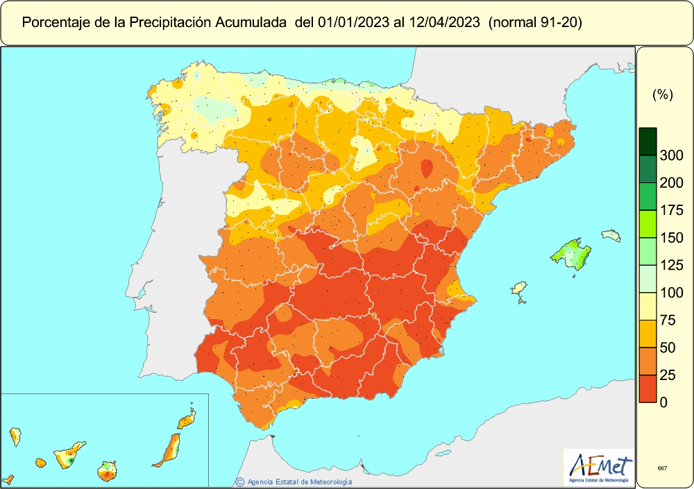 Rapport à la normale de la pluviométrie en Espagne du 1er janvier au 12 avril 2023 - via AEMet