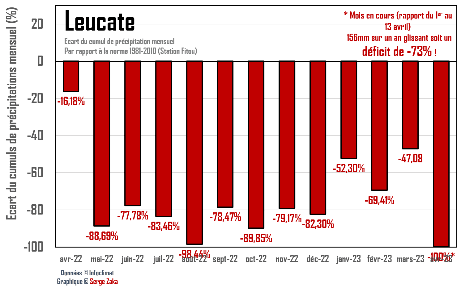 Anomalies pluviométriques mensuelles à Leucate (Aude) depuis avril 2022 - via Twitter @SergeZaka