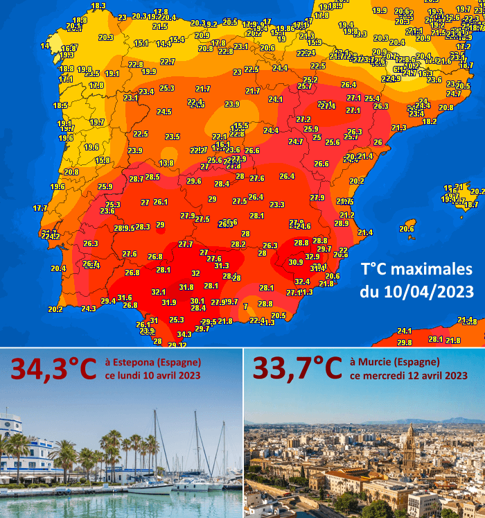 Carte des températures maximales en Espagne le 10 avril 2023 - via meteociel.fr