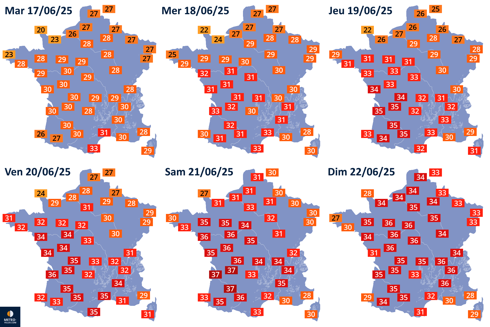 Températures maximales prévues du mardi 17 au dimanche 22 juin 2025 - Météo Villes