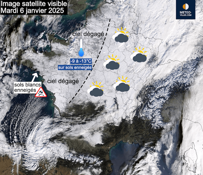 Mardi 6 janvier 2025, au matin, les les gelées étaient particulièrement forte sur toutes les régions enneigées où le ciel était dégagé, c'est-à-dire au nord d'une ligne Limoges, Orléans, Reims.