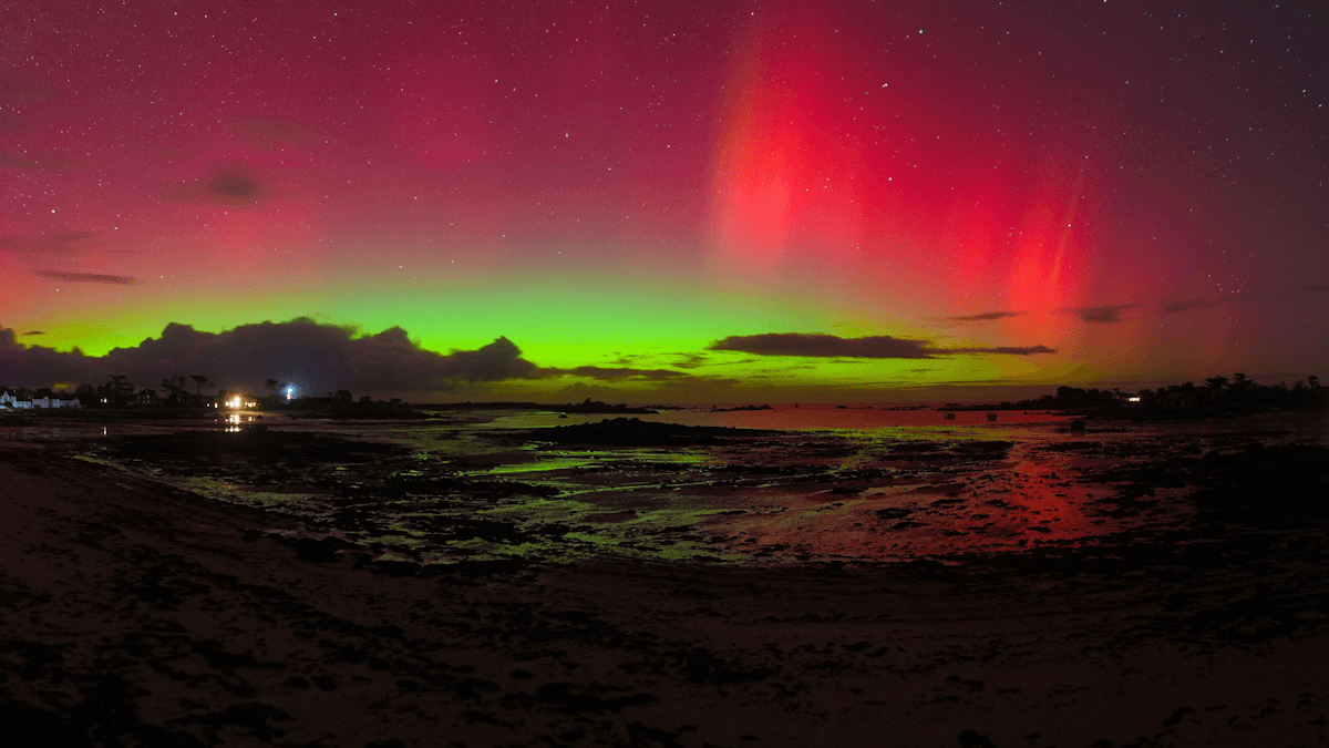Grâce à de larges éclaircies et sa position géographique relativement septentrionale, le nord de la Bretagne a tiré son épingle du jeu et fut l'un des meilleurs endroits du pays pour observer les aurores boréales. Sur la côte de Granit Rose, le spectacle fut remarquable comme le montre le cliché du photographe Mathieu Rivrin. Outre le rose, couleur la plus facile à observer à nos latitudes, le vert s'est aussi largement invité dans le ciel. On pouvait observer les aurores à l'œil nu, bien que les appareils photos font davantage ressortir les couleurs.