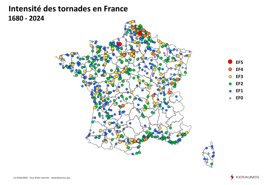 Tornades recensées en France de 1680 à 2024 et intensité (de EF0 à EF5) - keraunos.org