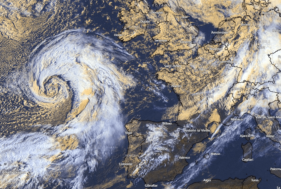 La tempête Mathis au large de la France le 30 mars 2023 - image satellite via Windy