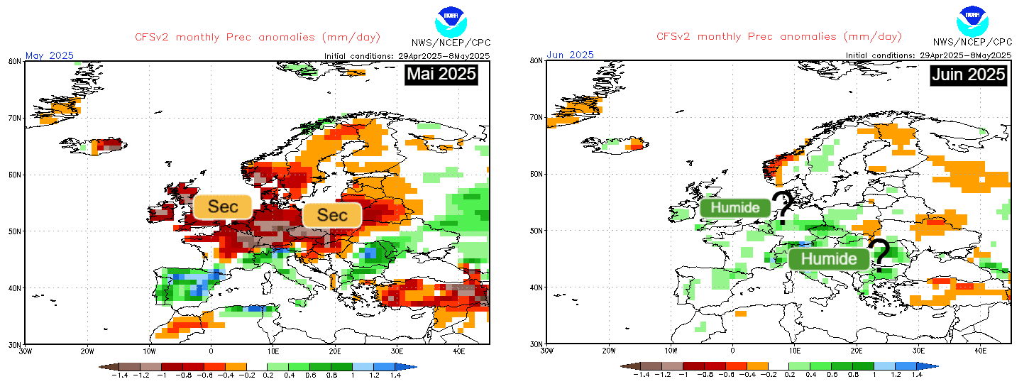 Anomalies de précipitations sur l'Europe pour les mois de mai et juin 2025 - CFS