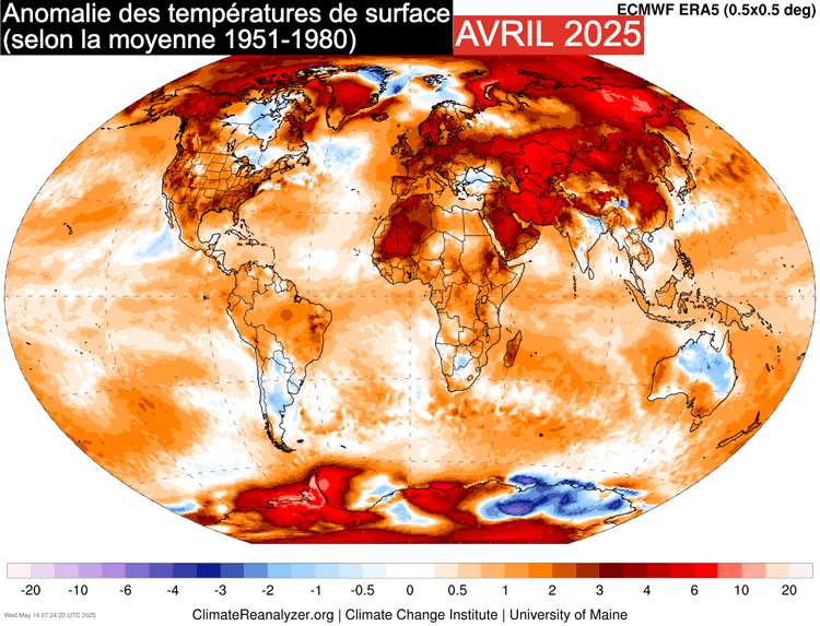 Le réchauffement de la planète a évidemment un effet sur les océans et en avril 2025, les surfaces où les températures de la mer était plus élevées que la normale 1951-1980 étaient de très loin, majoritaire.