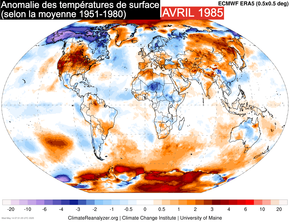 Lorsque l’on compare les anomalies thermique planétaires au niveau régional (et en avril, tous les 20 ans depuis 1965 sur la même période de référence), le constat est sans appel…! Les cartes rougissent de plus en plus, car l’écart à la moyenne des températures sur ces 30 années de référence est de plus en plus grand !