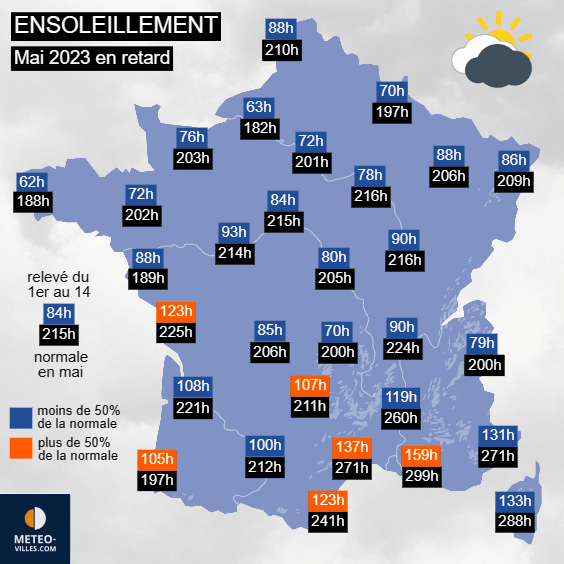Pour le moment, le mois de mai 2023 semble bien parti pour devenir le troisième mois du printemps moins ensoleillé que la normale. S'il reste encore la seconde moitié du mois, les taux d'ensoleillement des deux premières semaines sont souvent déficitaires, notamment dans le nord du pays. Paris n'a enregistré que 72 heures de soleil entre le 1er et le 14 mai 2023. Il faudrait une seconde quinzaine nettement plus ensoleillée pour atteindre la normale de 201h. Certaines stations du midi sont pour le moment dans les temps pour espérer atteindre la normale d'un mois de mai.