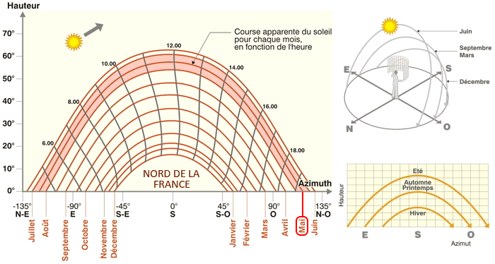 Hauteur du soleil dans le ciel au cours de l'année pour le nord de la France - via energieplus-lesite.be