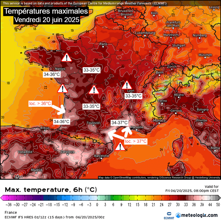 Températures maximales attendues sur la France entre le 20 et le 21 juin 2025 – Modèle ECMWF-HRES via meteologix