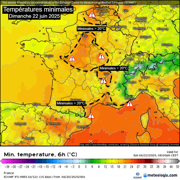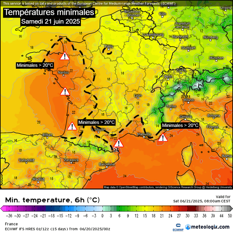 Températures minimales attendues sur la France entre le 21 et le 22 juin 2025 - Modèle ECMWF-HRES via meteologix