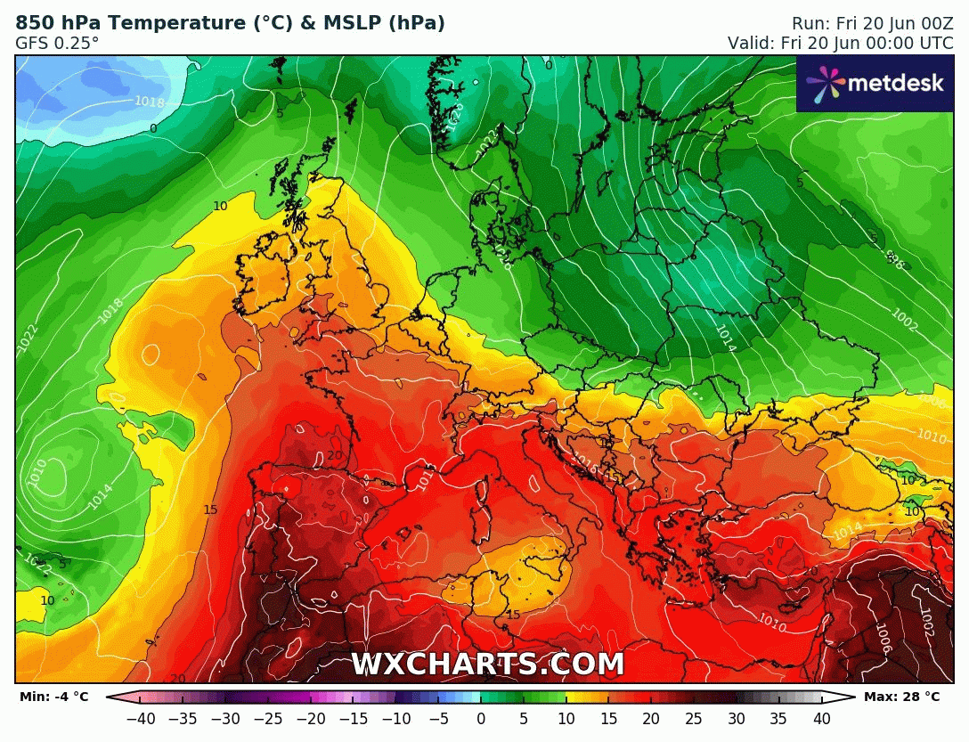 Animation des températures à 850hPa sur l'Europe du 20 au 24 juin 2025 - Modèle GFS via WX CHARTS