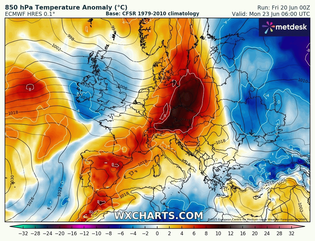 Animation des anomalies de températures à 850 hPa sur l'Europe du 23 au 27 juin 2025 - Modèle ECMWF-HRES via WX CHARTS