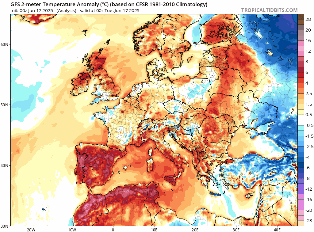 Anomalies de températures à 2m sur l'Europe entre le 17 et le 23 juin 2025 – Via TropicalTidBits