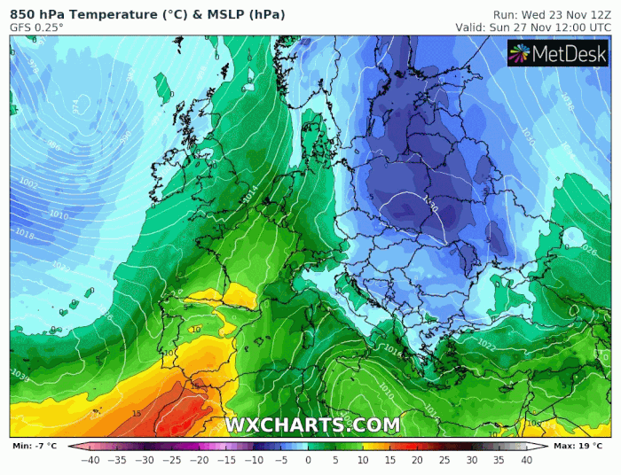 Modélisation de la masse d'air à 1500m du 27 novembre au 6 décembre 2022 - via wcharts.com