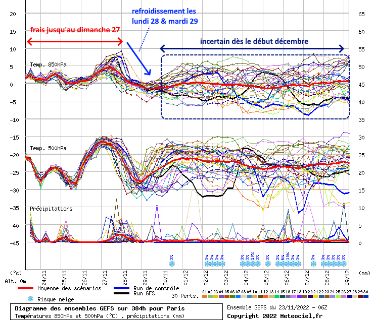 Si la mise en place d'un blocage anticyclonique sur la Scandinavie et l'ouest de la Russie est plus que probable, ses conséquences sur la France sont encore soumises à d'importantes incertitudes. Les diagrammes des différents scénarios permettent d'y voir plus clair. On constate le maintien d'une certaine fraîcheur jusqu'à la fin de la semaine avant qu'un refroidissement modéré ne survienne en début de semaine prochaine (les 28 et 29 novembre) avec une fiabilité très correcte. En revanche, les scénarios se dispersent dès les premiers jours de décembre 2022, certains s'enfonçant vers un froid plus net et hivernal tandis que d'autres se radoucissent quelque peu...