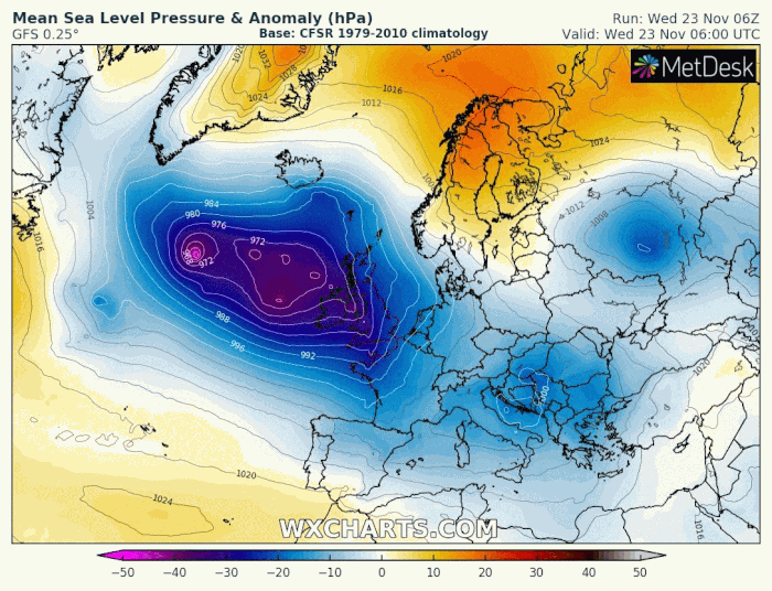 Anomalies de pressions (bleu = dépressionnaire, orange/rouge = anticyclonique) du 23 novembre au 4 décembre 2022 - via wxcharts.com