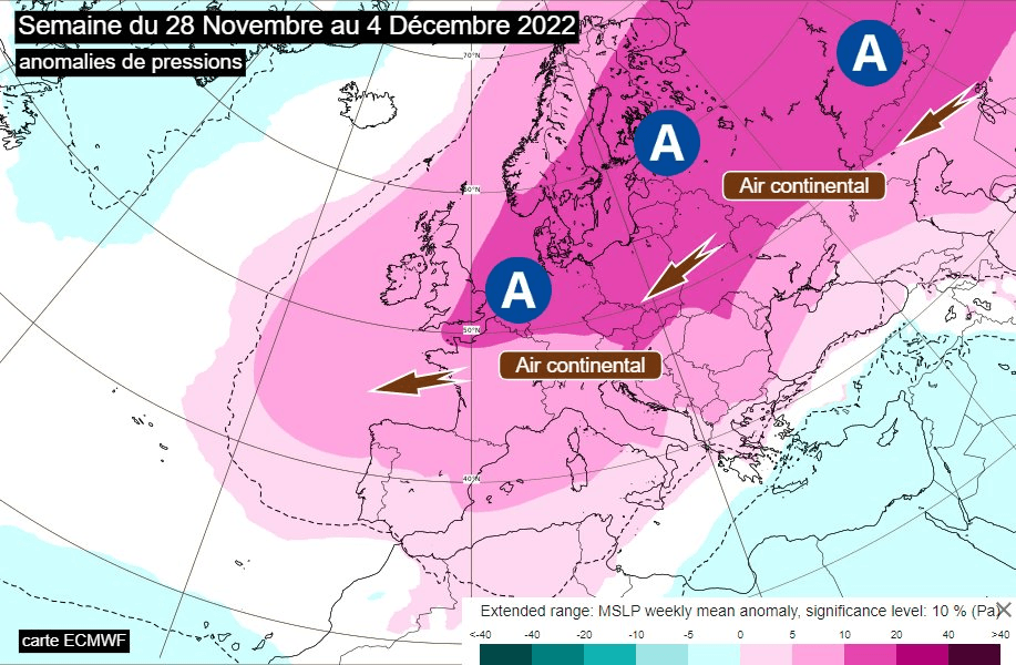 Anomalies de pressions pour la semaine du 28 novembre au 4 décembre 2022 - carte ECMWF