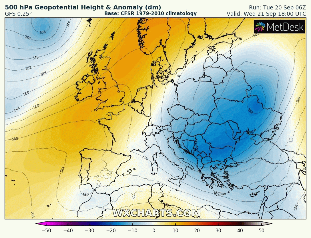 Anomalies de géopotentiels du mercredi 21 au lundi 26 septembre 2022 - via wxcharts.com