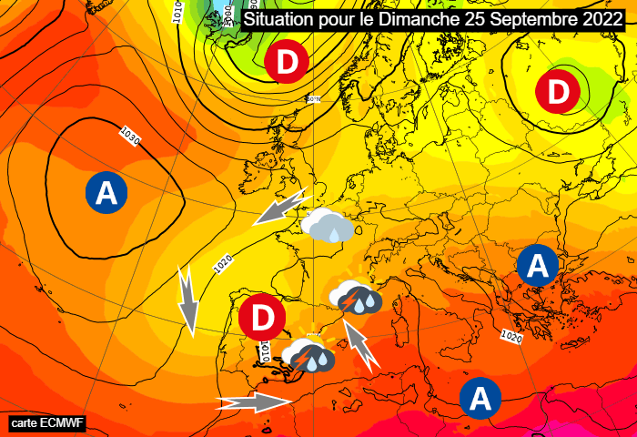 Nous sommes actuellement sous l'influence d'une barrière de hautes pressions s'étirant des Açores jusqu'à la Scandinavie, visible en jaune au début de l'animation ci-dessous. D'ici vendredi, cette cellule anticyclonique va s'affaisser, permettant à une anomalie dépressionnaire transitant vers l'Islande de faire plonger un talweg en direction du golfe de Gascogne. Une anomalie dépressionnaire se formera alors dans les parages de la péninsule ibérique pour ce week-end des 24 et 25 septembre 2022.
