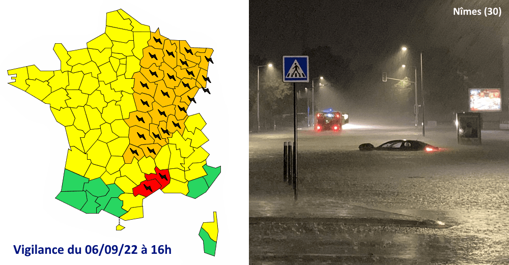 Vigilance du 6 septembre 2022 et inondations à Nîmes (30) - via Météo France & @RaphBtd75