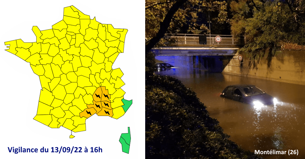 Vigilance du 13 septembre 2022 et inondations à Montélimar (26) - via Météo France & Karine Wierzba / Le Dauphiné
