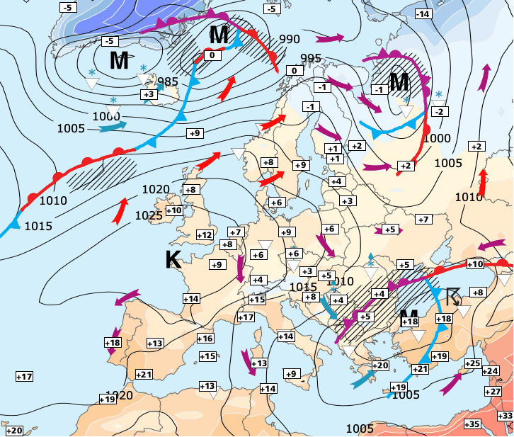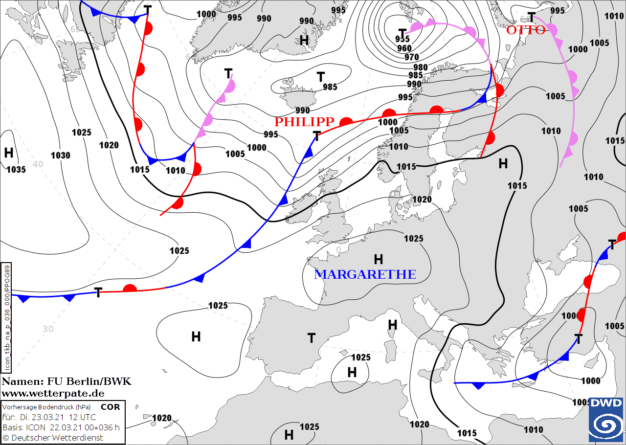 Noms des dépressions et anticyclones prévus pour mardi 23 mars 2021 à midi (Berlin)