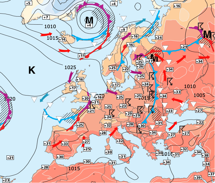 Noms des dépressions et anticyclones prévus pour dimanche 27 juin 2021 à midi (Berlin)