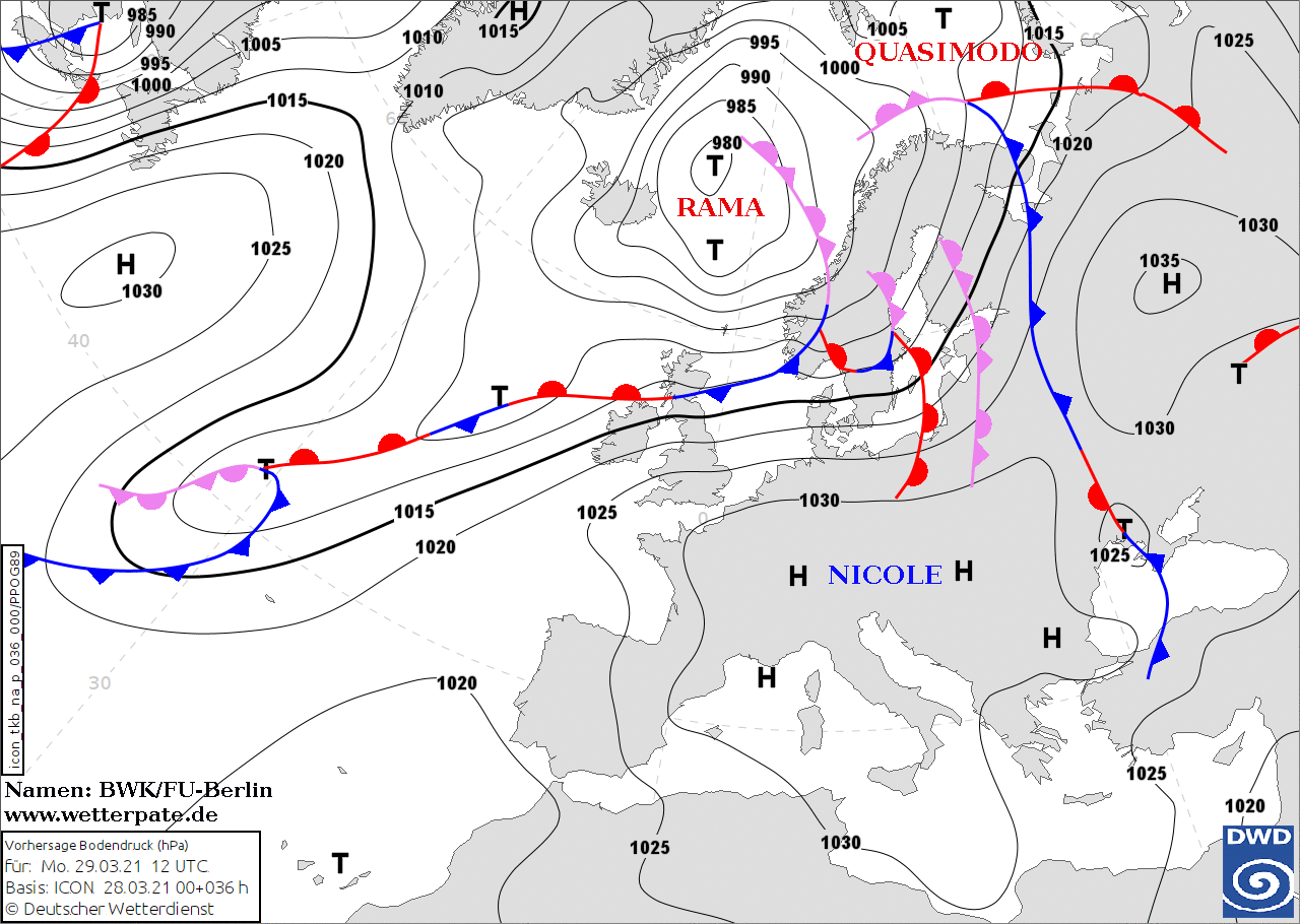 Noms des dépressions et anticyclones prévus pour lundi 29 mars 2021 à midi (Berlin)