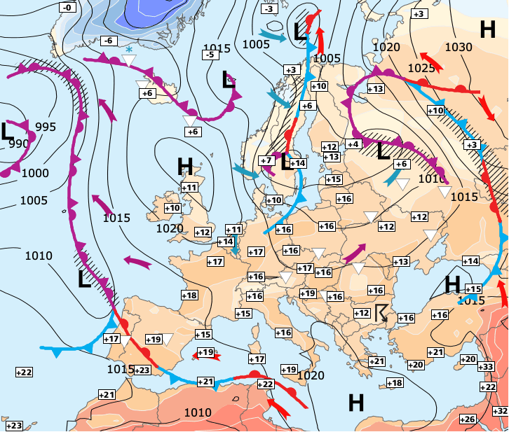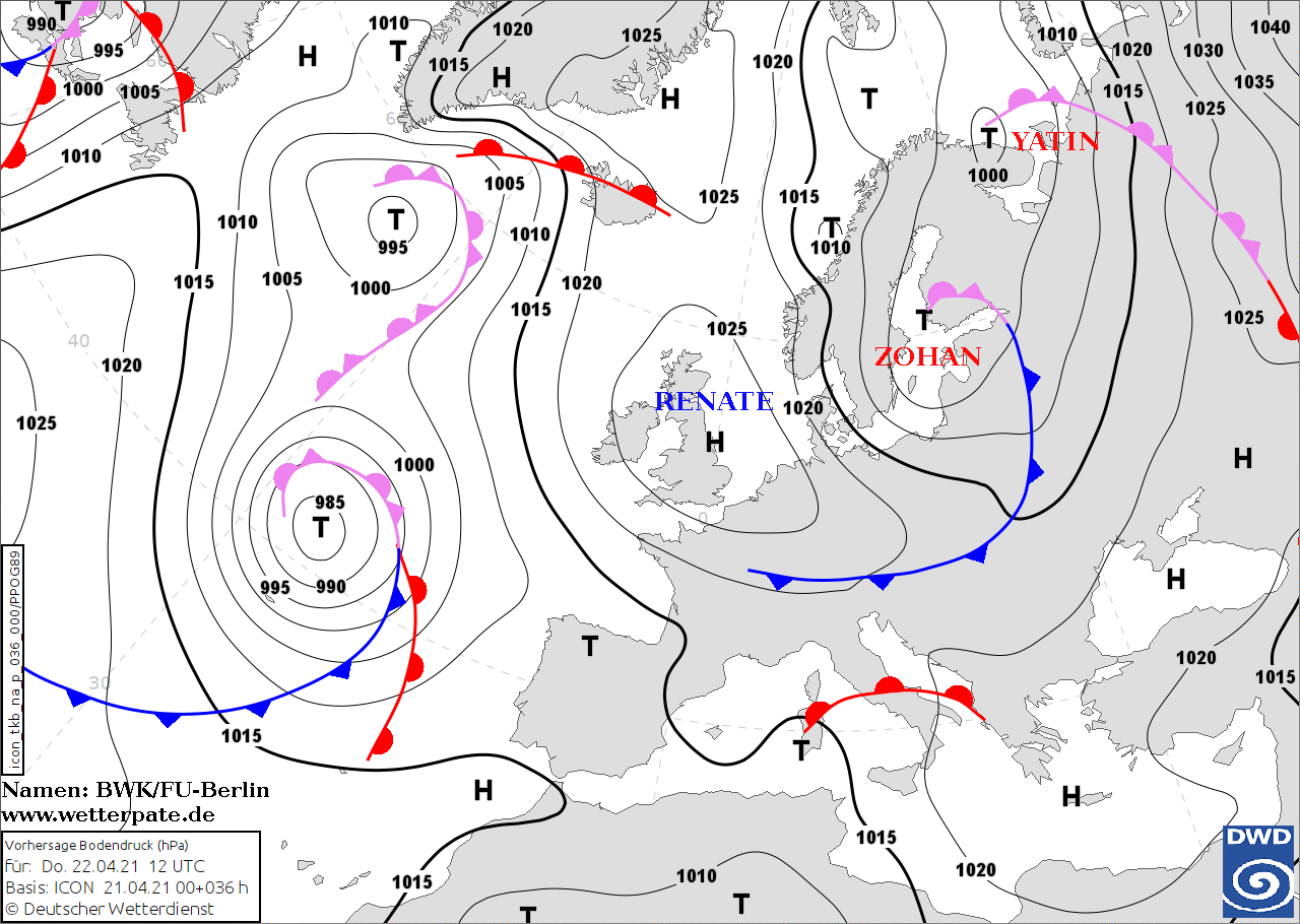 Noms des dépressions et anticyclones prévus pour jeudi 22 avril 2021 à midi (Berlin)