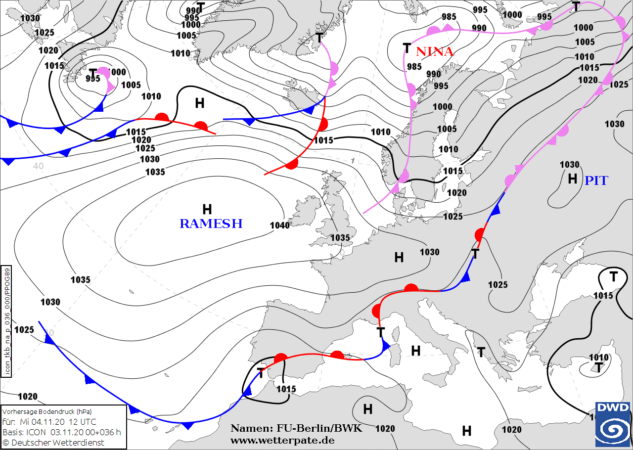 Noms des dépressions et anticyclones prévus pour jeudi 5 novembre 2020 à midi (Berlin)