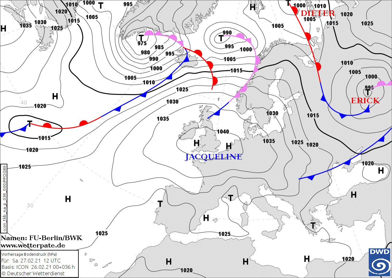 Noms des dépressions et anticyclones prévus pour samedi 27 février 2021 à midi (Berlin)