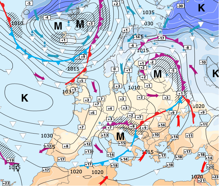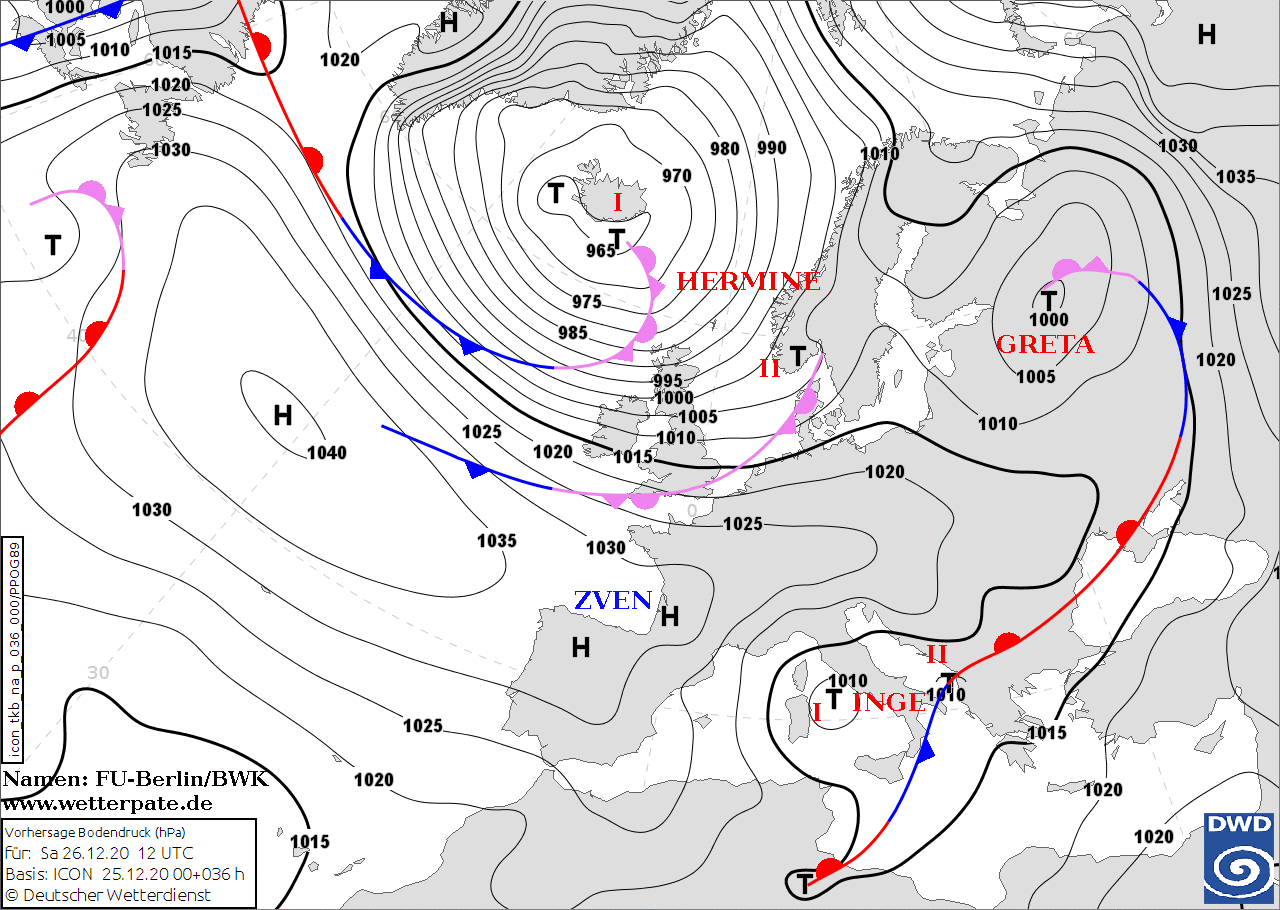 Noms des dépressions et anticyclones prévus pour samedi 26 décembre 2020 à midi (Berlin)
